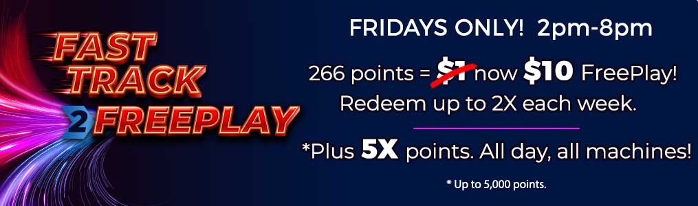 266 points = $10 in FreePlay. All guests will receive 5X points all day on all machines, up to 5,000 points! Must swipe at the kiosk to activate.